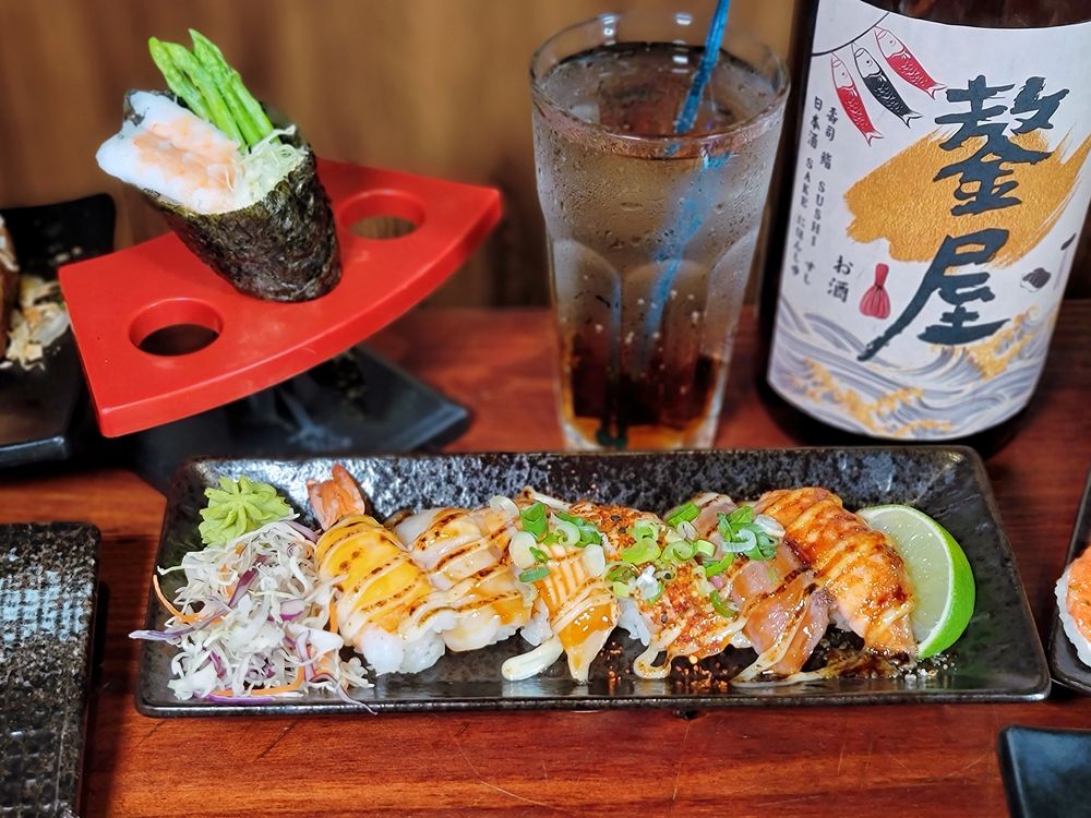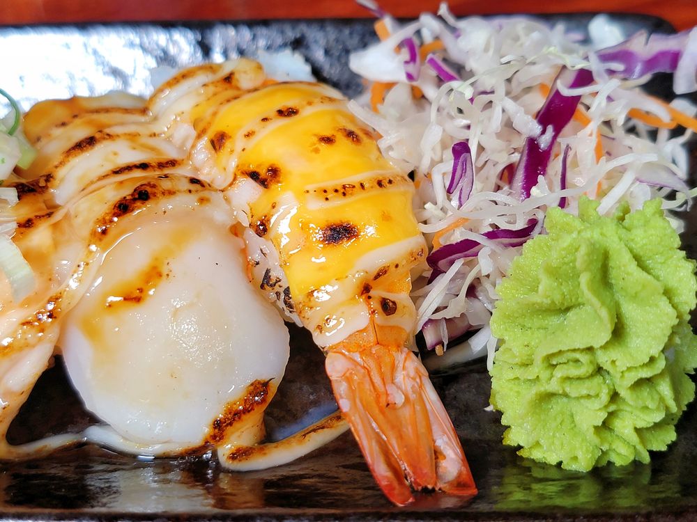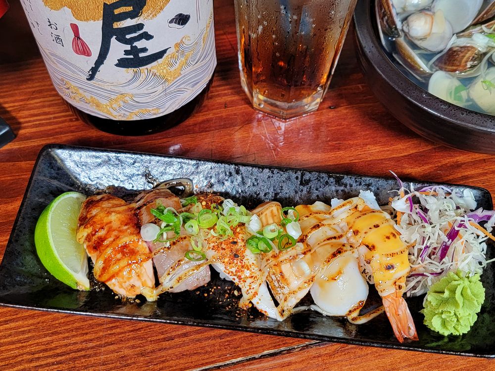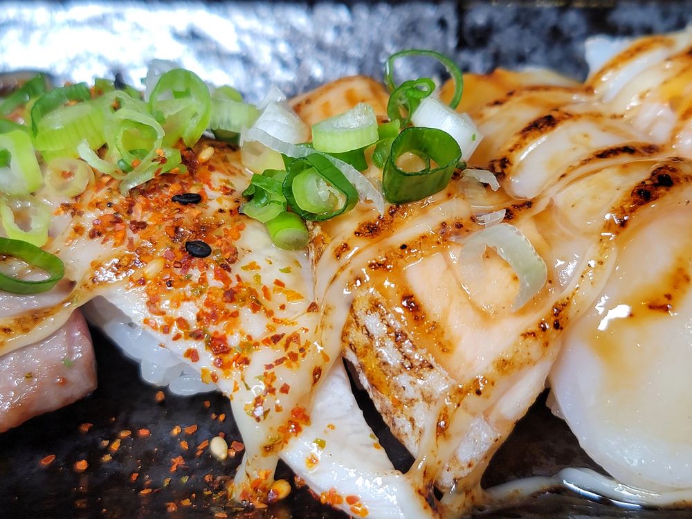 經過炙燒可以吃到各種海鮮食材的美味和香甜,附上山葵和生菜絲,美乃滋控肯定欲罷不能,炙燒壽司上面擠有加入美乃滋的特調醬,加上辣椒、芝麻、蔥花,好吃到一口接一口。