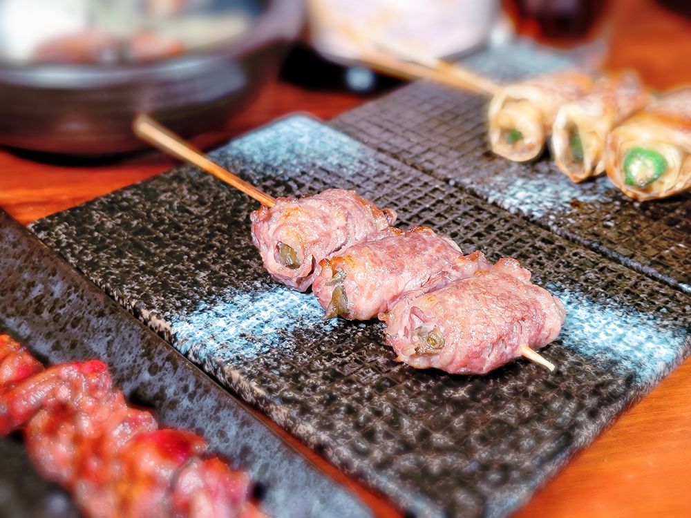 當然要點我超愛的牛小排啦!牛小排捲起剝皮辣椒,這組合倒是第一次品嘗,牛小排的潤嫩香甜搭配剝皮辣椒的鹹辣甘甜也太搭啦!口感層次豐富,怕辣的朋友也可以吃,經過醃漬的剝皮辣椒只有微微微辣,連怕辣的日本人都可以吃唷。