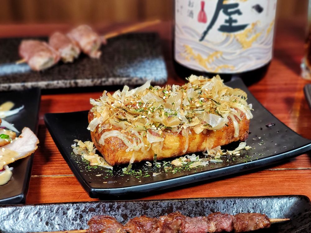 鏊屋私房特製的獨家料理「鏊屋燒」是人氣必點的餐廳經典招牌美味唷!長方形料理上面撒上柴魚片、芝麻昆布粉,一湯匙挖下,吃得到豐富的鹹香美味和外層酥脆、內在綿密的口感......好好味!有點熟悉的味道,口感介於大阪燒和章魚燒之間。居酒屋以特調粉漿加上高麗菜絲、起司醬,同樣是現點現做,慢火香煎至金黃色,刷上醬汁,最後撒上柴魚片、芝麻昆布粉......果然跟我在日本吃玩大阪燒很像捏!好吃!難怪從鏊屋創店至今人氣不墜,蔚為經典!