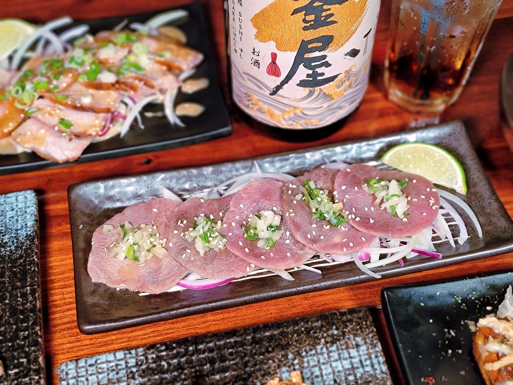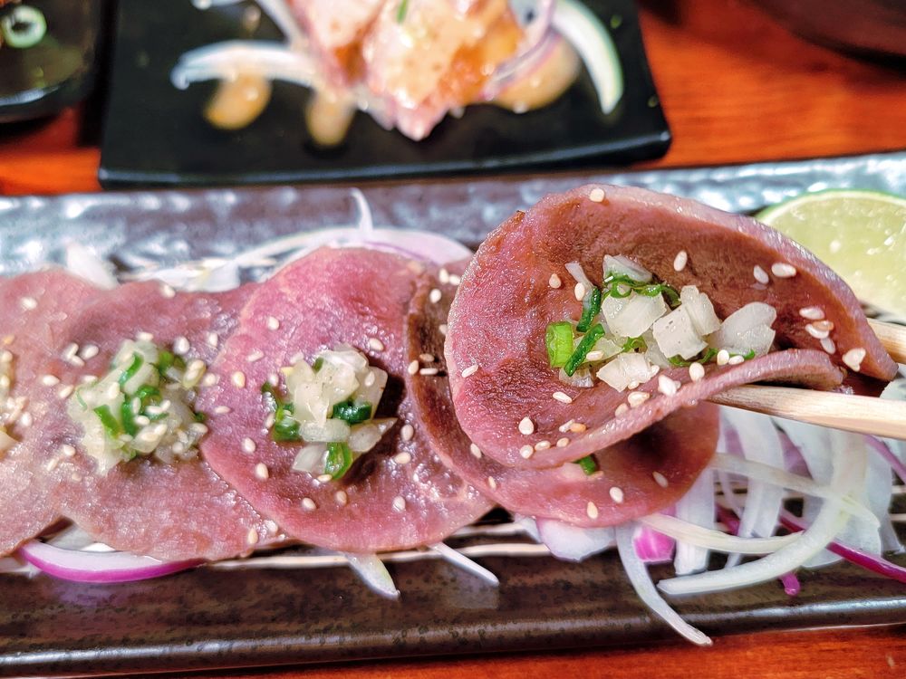 切成薄片適中的牛舌經過香烤,搭配醃漬過的洋蔥、蔥花、芝麻,再來點生洋蔥捲起來吃,鹹香好風味。