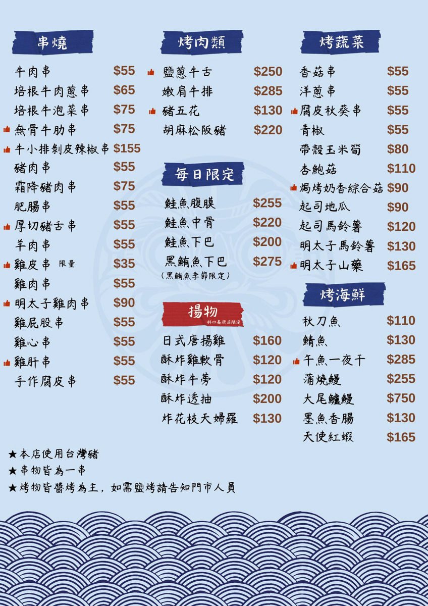 「鏊屋 串燒/壽司/酒場-林口長庚店」菜色豐富,提供刺身、壽司、串燒、烤肉、烤海鮮和特色料理,太多想吃的不知道怎麼選擇?可以參考鏊屋菜單上的店家推薦唷!價位從45元的手捲和串燒起價,樣樣美味不踩雷,「鏊屋」以好口碑擄獲吃貨心,所以分店一家接一家開。