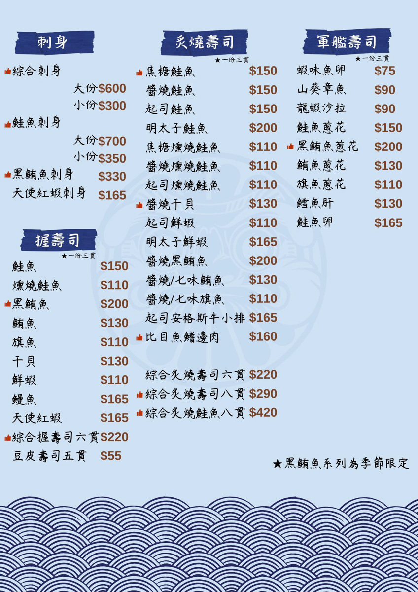 喜歡刺身、壽司的吃貨們,「鏊屋」的刺身推薦有綜合刺身、鮭魚刺身、黑鮪魚刺身。壽司提供有握壽司、炙燒壽司、軍艦壽司,還有假日限定和季節限定的黑鮪魚系列,鏊屋推薦的有黑鮪魚和綜合握壽司(六貫),炙燒壽司推薦的有焦糖鮭魚、醬燒干貝、起司鮮蝦、綜合炙燒壽司(六貫),軍艦壽司店家推薦黑鮪魚蔥花口味。