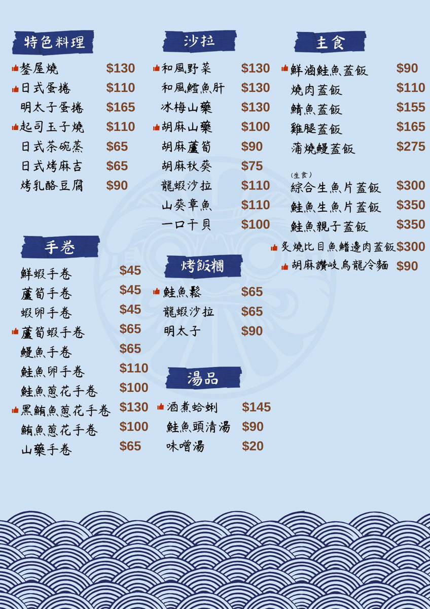 特色料理像是鏊屋燒、日式蛋捲和起司玉子燒都是人氣推薦,多達10種口味的手卷店家推薦蘆筍蝦手卷和黑鮪魚蔥花手卷。另外還有特色料理、主食、沙拉、手卷、烤飯糰、湯品像是和風野菜沙拉、鮭魚鬆烤飯糰、酒煮蛤蜊,主食像是鮮滷鮭魚蓋飯、胡麻讚岐烏龍冷麵都是店家招牌推薦。